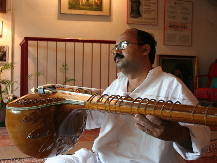 Radhey Shyam Sharma ist ein Handwerksmeister aus Varanasi, dem spirituellen Zentrum Indiens, wo jahrhundertealte Traditionen noch immer die Kunst des Musikinstrumentenbaus prägen. Er führt die Familientradition in vierter Generation fort und hat sich auf die Fertigung klassischer indischer Instrumente spezialisiert.